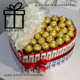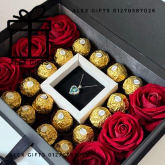 بوكس رومانسي فاخر من الشوكولاتة الروشيه الإيطالية وشوكولاتة الكندر مع ورد صناعي لا يذبل عشان يكون ذكري طول العمر