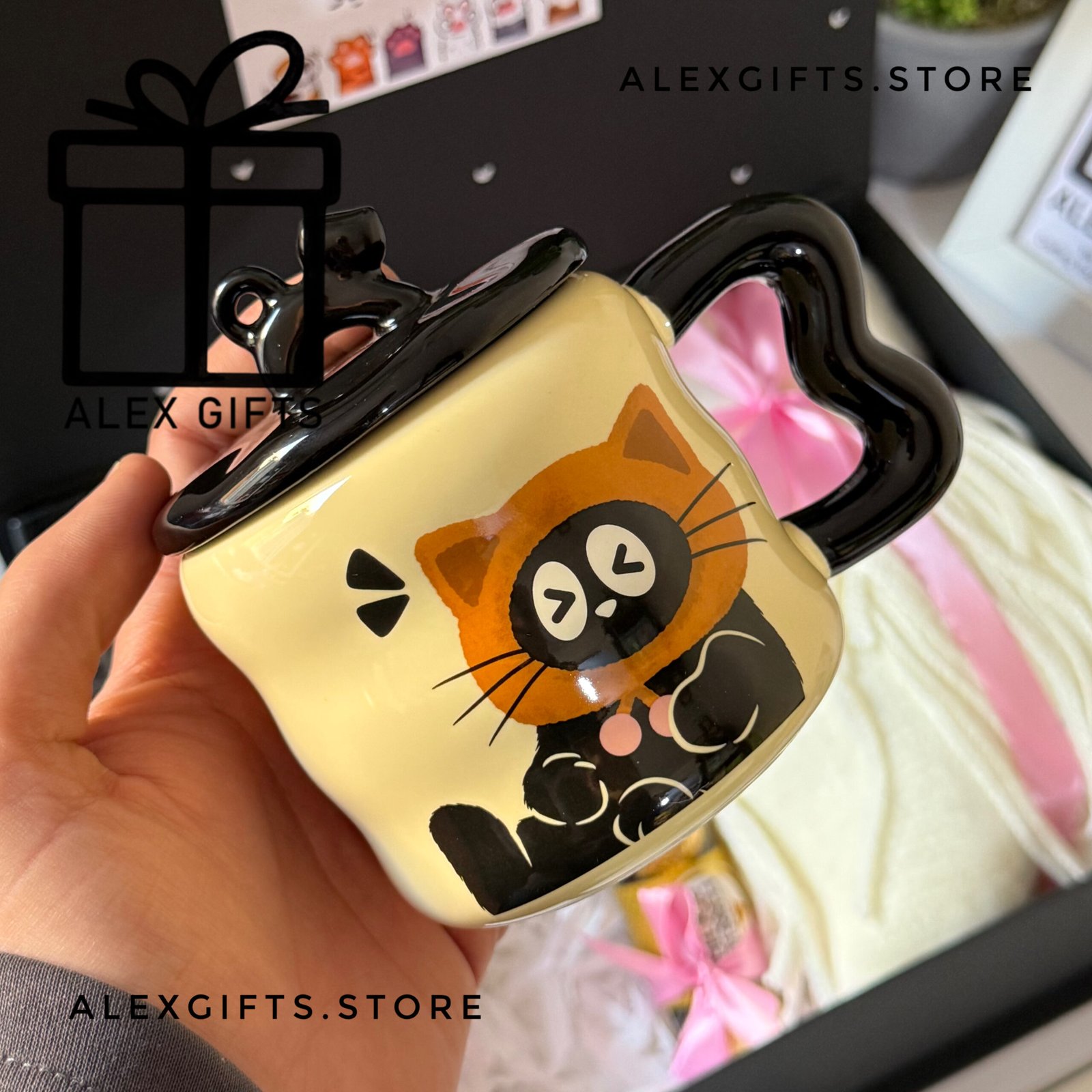 مكون من : مج قطة مجسم مستورد مع غطاء و معلقة